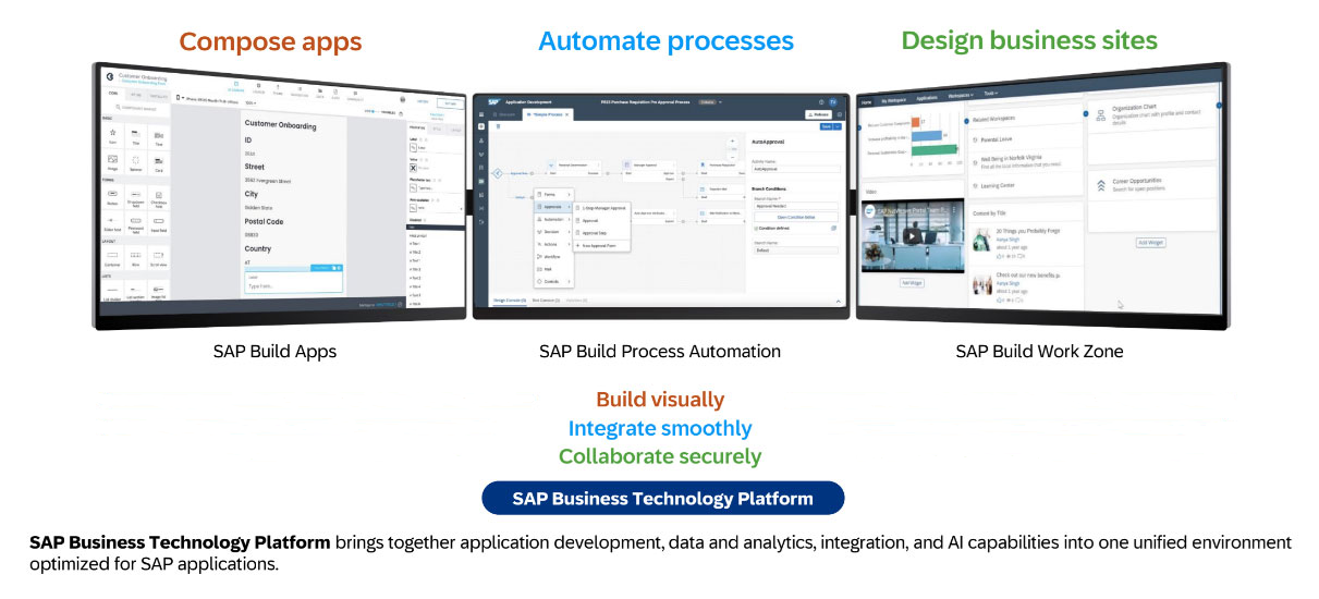 SAP Build empowers anyone to visually design applications, automate workflows, and create websites – no coding needed! This low-code development suite enables you to build custom applications to help boost productivity, improve collaboration, and increase efficiency.
